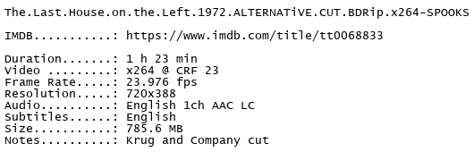 Release Name : The.Last.House.on.the.Left.1972.ALTERNATiVE.CUT.BDRip.x264-SPOOKS