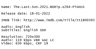 https://www.filefactory.com/file/1wvbib6setzg/The.Last.Son.2021.BDRip.x264-PiGNUS.rar