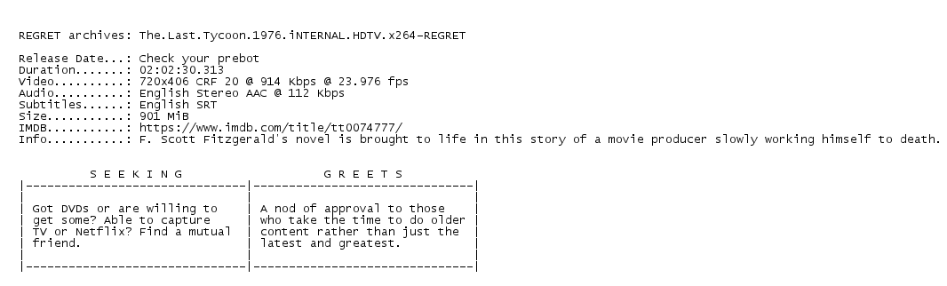 Release Name : The.Last.Tycoon.1976.iNTERNAL.HDTV.x264-REGRET