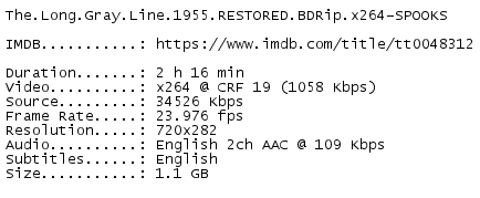 Release Name : The.Long.Gray.Line.1955.RESTORED.BDRip.x264-SPOOKS