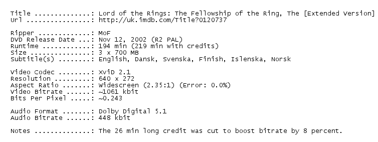 Release Name : The.Lord.Of.The.Rings.The.Fellowship.Of.The.Ring.2001.Extended.DVDRip.AC3.XviD-MoF