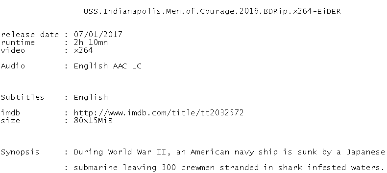 Release Name : USS.Indianapolis.Men.of.Courage.2016.BDRip.x264-EiDER
