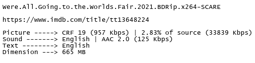 Release Name : Were.All.Going.to.the.Worlds.Fair.2021.BDRip.x264-SCARE