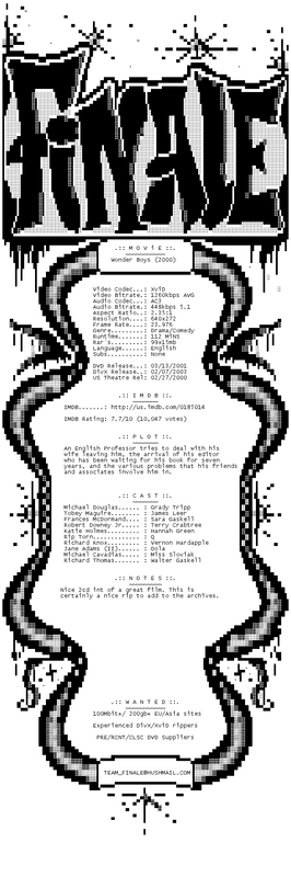 Release Name : Wonder.Boys.2000.INTERNAL.DVDRip.XviD-FiNaLe