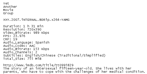 Release Name : XXY.2007.iNTERNAL.BDRip.x264-YAMG
