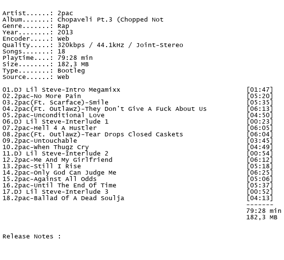 Release Name : 2pac-Chopaveli.Pt.3.Chopped.Not.Slopped.By.DJ.Lil.Steve.Bootleg.2013-TXMAD3.INT