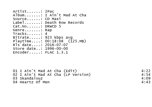 Release Name : 2Pac-I.Aint.Mad.At.Cha.DRWCD.5.CDM.FLAC.1996-WRE