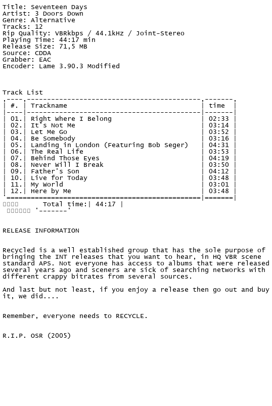 Release Name : 3.Doors.Down-Seventeen.Days.Retail.2005-Recycled.INT