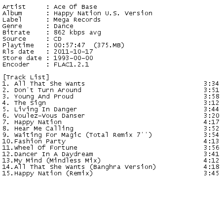 Release Name : Ace.Of.Base-Happy.Nation.U.S.Version.CD.FLAC.1993-WRE