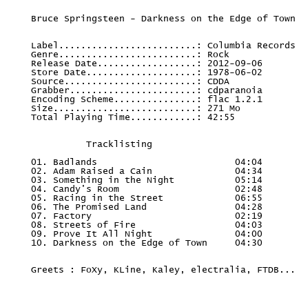 Release Name: Bruce.Springsteen-Darkness.on.the.Edge.of.Town.CD.FLAC.1978-FADA