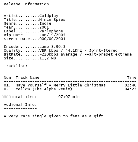 Release Name : Coldplay-Mince.Spies.CDS.2001-BoLo.INT