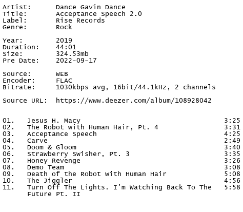 Release Name : Dance.Gavin.Dance-Acceptance.Speech.2.0.16BIT.WEB.FLAC.2019-VEXED