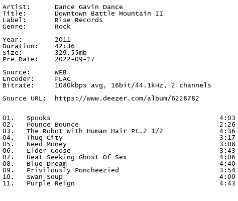 Release Name : Dance.Gavin.Dance-Downtown.Battle.Mountain.II.16BIT.WEB.FLAC.2011-VEXED