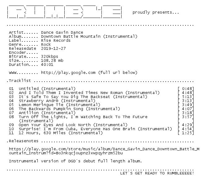 Release Name : Dance.Gavin.Dance-Downtown.Battle.Mountain.Instrumental.WEB.2019-RUMBLE
