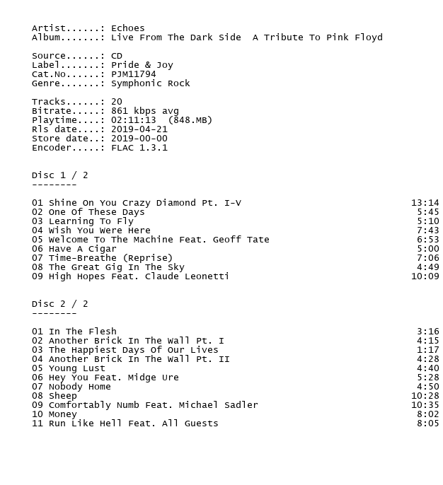Release Name: Echoes-Live.From.The.Dark.Side.A.Tribute.To.Pink.Floyd.PJM11794.2CD.FLAC.2019-WRE