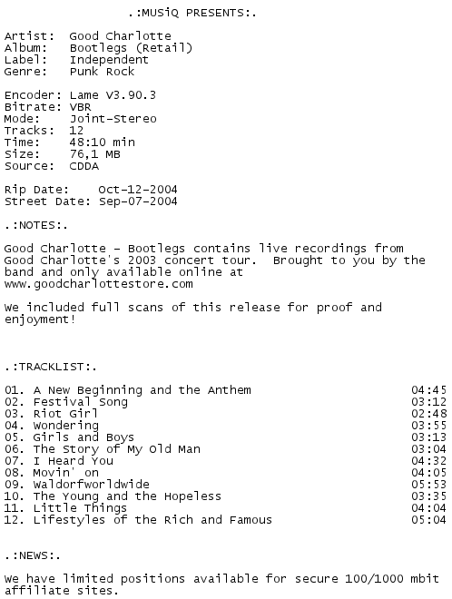 Release Name : Good.Charlotte-Bootlegs.Retail.2004-MUSiQ