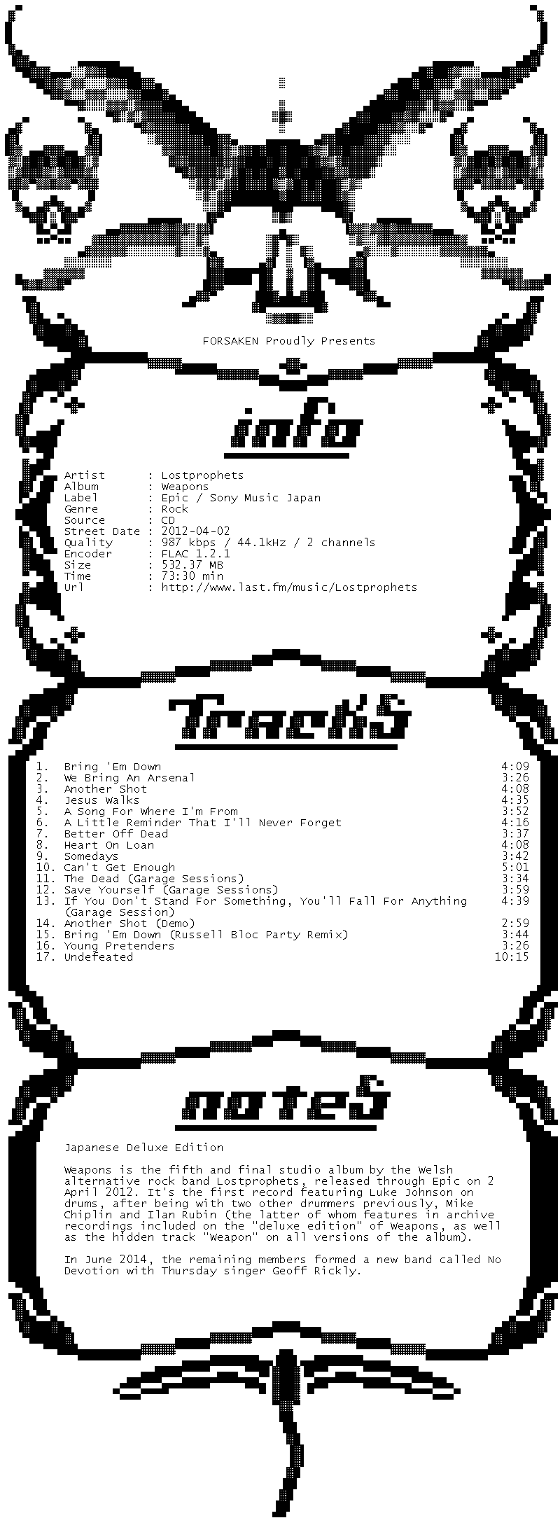 Release Name : Lostprophets-Weapons.JP.Deluxe.Edition.CD.FLAC.2012-FORSAKEN