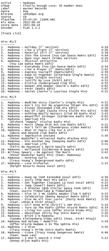 Release Name : Madonna-Finally.Enough.Love.50.Number.Ones.Remastered.3CD.FLAC.2022-PERFECT