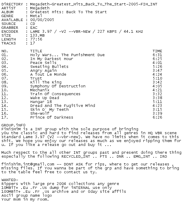 Release Name : Megadeth-Greatest.Hits.Back.To.The.Start.2005.INT-FIH