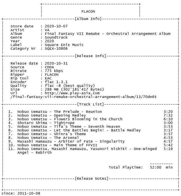 Release Name : Nobuo.Uematsu-Final.Fantasy.VII.Remake.Orchestral.Arrangement.Album.OST.CD.FLAC.2020-FLACON