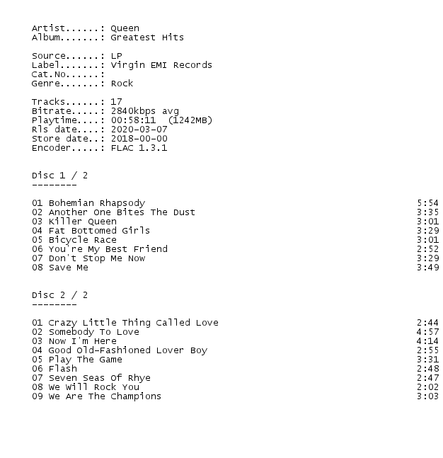 Release Name : Queen-Greatest.Hits.REISSUE.REMASTERED.2LP.FLAC.2018-WRE