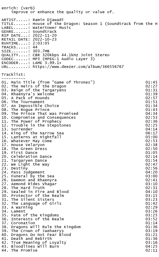 Release Name : Ramin.Djawadi-House.of.the.Dragon.Season.1.Soundtrack.from.the.HBO.Series.OST.WEB.2022-ENRiCH