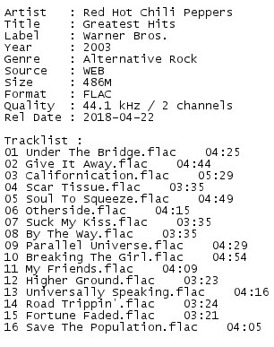 Release Name : Red.Hot.Chili.Peppers-Greatest.Hits.WEB.FLAC.2003-VvV