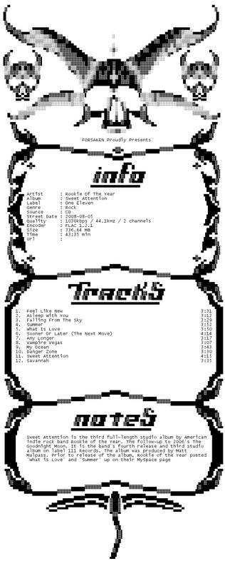 Sweet Attention is the third full-length studio album by American indie rock band Rookie of the Year. The follow-up to 2006’s The Goodnight Moon was released on 5 August 2008. It is the band’s fourth release and third studio album on label 111 Records. The album was produced by Matt Malpass.