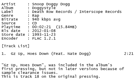 Release Name : Snoop.Doggy.Dogg-Doggystyle.Bonus.Track.CD.FLAC.1993-PERFECT