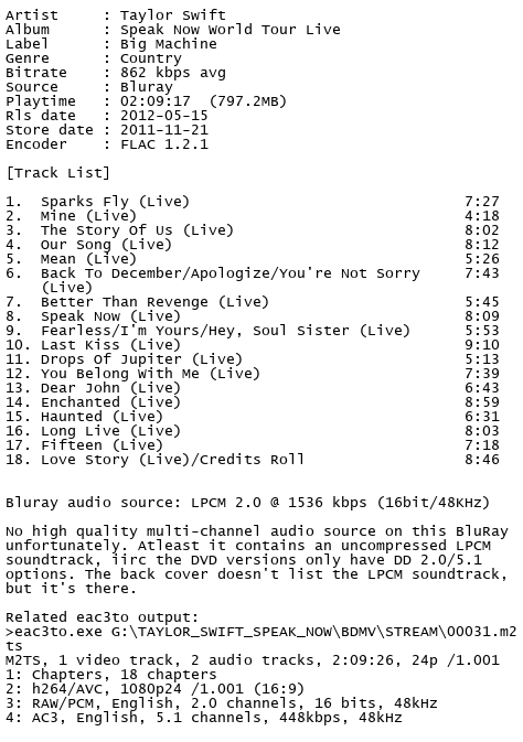 Release Name : Taylor.Swift-Speak.Now.World.Tour.Live.BLURAY.FLAC.2011-PERFECT