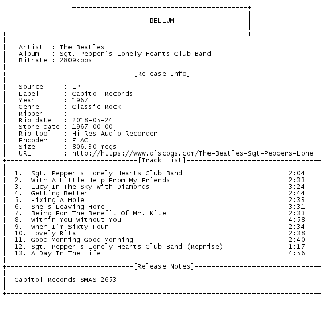 Release Name : The.Beatles-Sgt.Peppers.Lonely.Hearts.Club.Band.VINYL.FLAC.1967-BELLUM.INT
