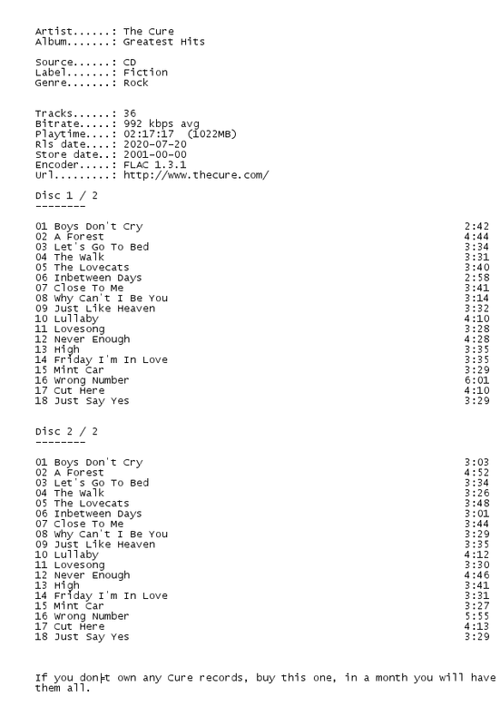Release Name : The.Cure-Greatest.Hits.2CD.FLAC.2001-401