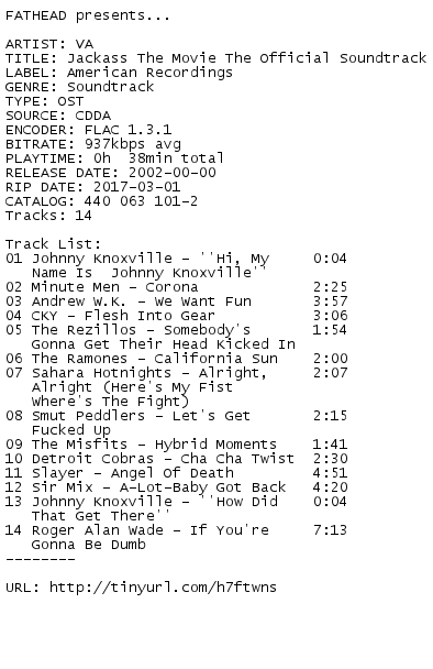 Release Name : VA-Jackass.The.Movie.The.Official.Soundtrack.OST.CD.FLAC.2002-FATHEAD
