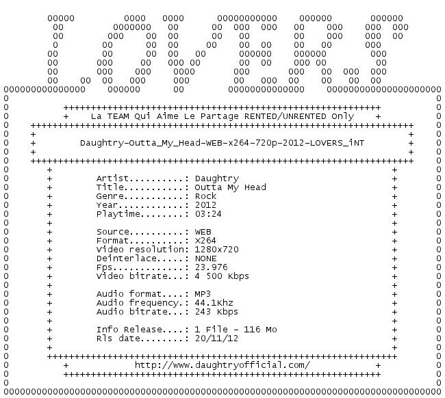 Release Name : Daughtry-Outta.My.Head.WEB.x264.720p.2012.iNT-LOVERS