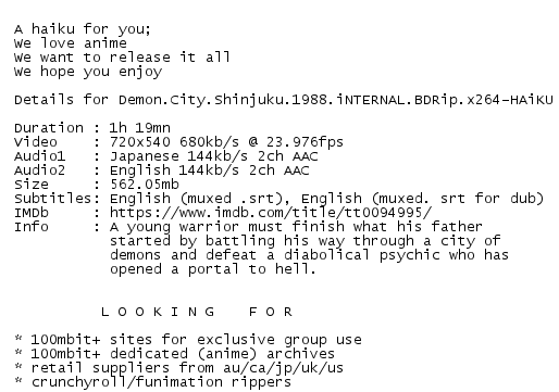 Release Name : Demon.City.Shinjuku.1988.iNTERNAL.BDRip.x264-HAiKU