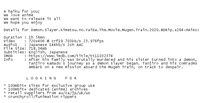 Release Name : Demon.Slayer.Kimetsu.no.Yaiba.The.Movie.Mugen.Train.2020.BDRip.x264-HAiKU