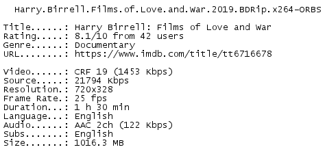 Release Name : Harry.Birrell.Films.of.Love.and.War.2019.BDRip.x264-ORBS