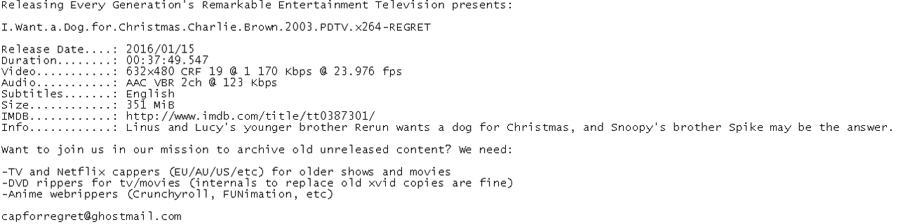 Release Name : I.Want.a.Dog.for.Christmas.Charlie.Brown.2003.PDTV.x264-REGRET