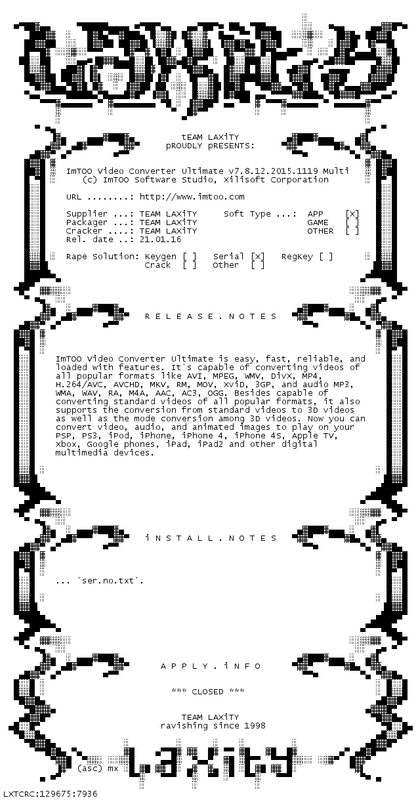 http://www.filefactory.com/file/7jxj0n0vy1mi/ImTOO.Video.Converter.Ultimate.v7.8.12.2015.1119.Multilanguage-LAXiTY.rar