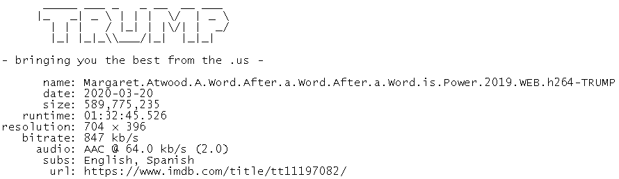 Release Name : Margaret.Atwood.A.Word.After.a.Word.After.a.Word.is.Power.2019.WEB.h264-TRUMP