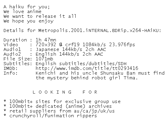 Release Name : Metropolis.2001.iNTERNAL.BDRip.x264-HAiKU
