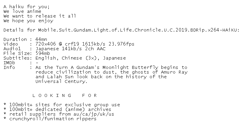 Release Name : Mobile.Suit.Gundam.Light.of.Life.Chronicle.U.C.2019.BDRip.x264-HAiKU