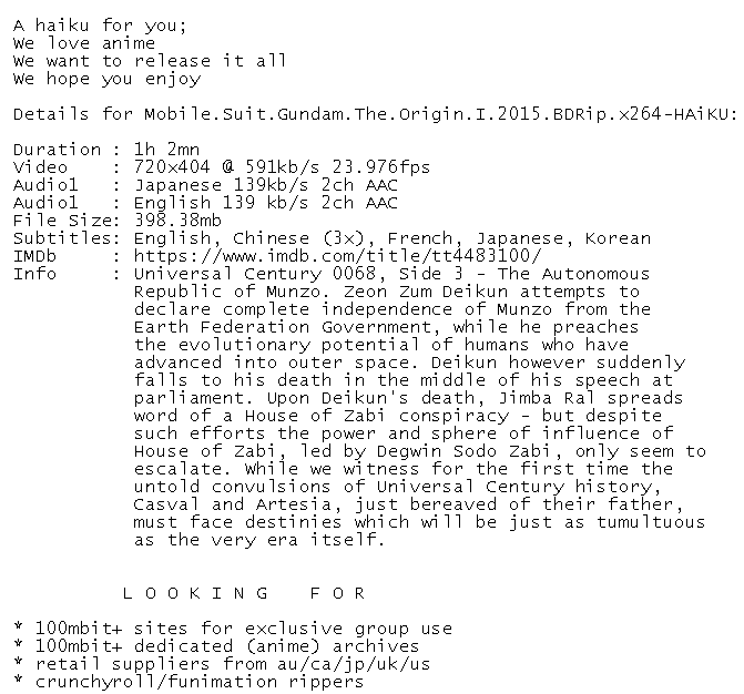 Release Name : Mobile.Suit.Gundam.The.Origin.I.2015.BDRip.x264-HAiKU