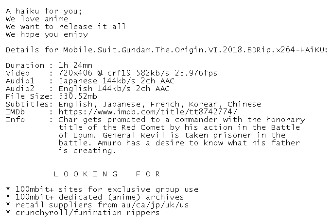 Release Name : Mobile.Suit.Gundam.The.Origin.VI.2018.BDRip.x264-HAiKU