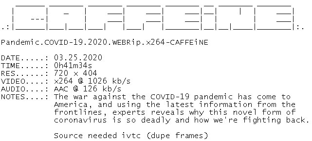 Release Name : Pandemic.COVID-19.2020.WEBRip.x264-CAFFEiNE