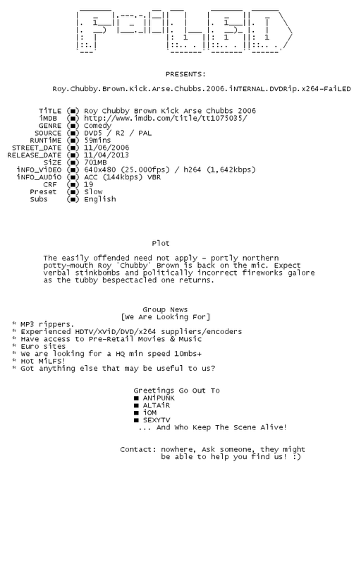Release Name : Roy.Chubby.Brown.Kick.Arse.Chubbs.2006.iNTERNAL.DVDRip.x264-FaiLED