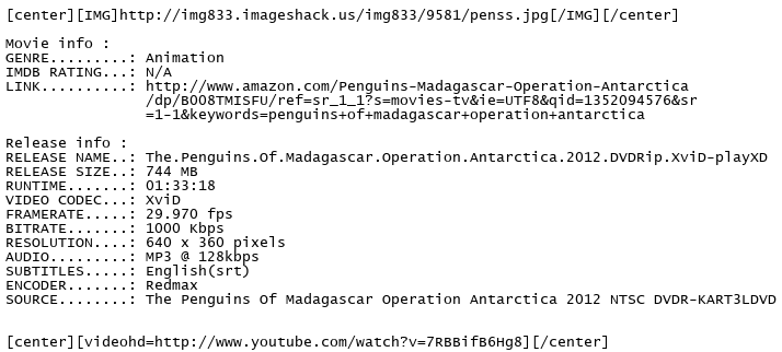 Release Name : The.Penguins.Of.Madagascar.Operation.Antarctica.2012.DVDRip.XviD-playXD