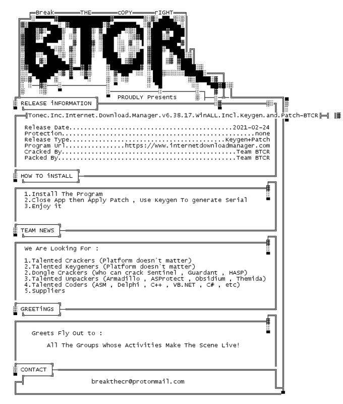 Release Name : Tonec.Inc.Internet.Download.Manager.v6.38.17.WinALL.Incl.Keygen.and.Patch-BTCR
