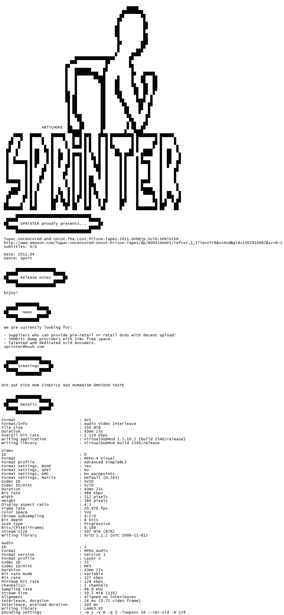 Release Name : Tupac.Uncencored.and.Uncut.The.Lost.Prison.Tapes.2011.DVDRip.XviD-SPRiNTER